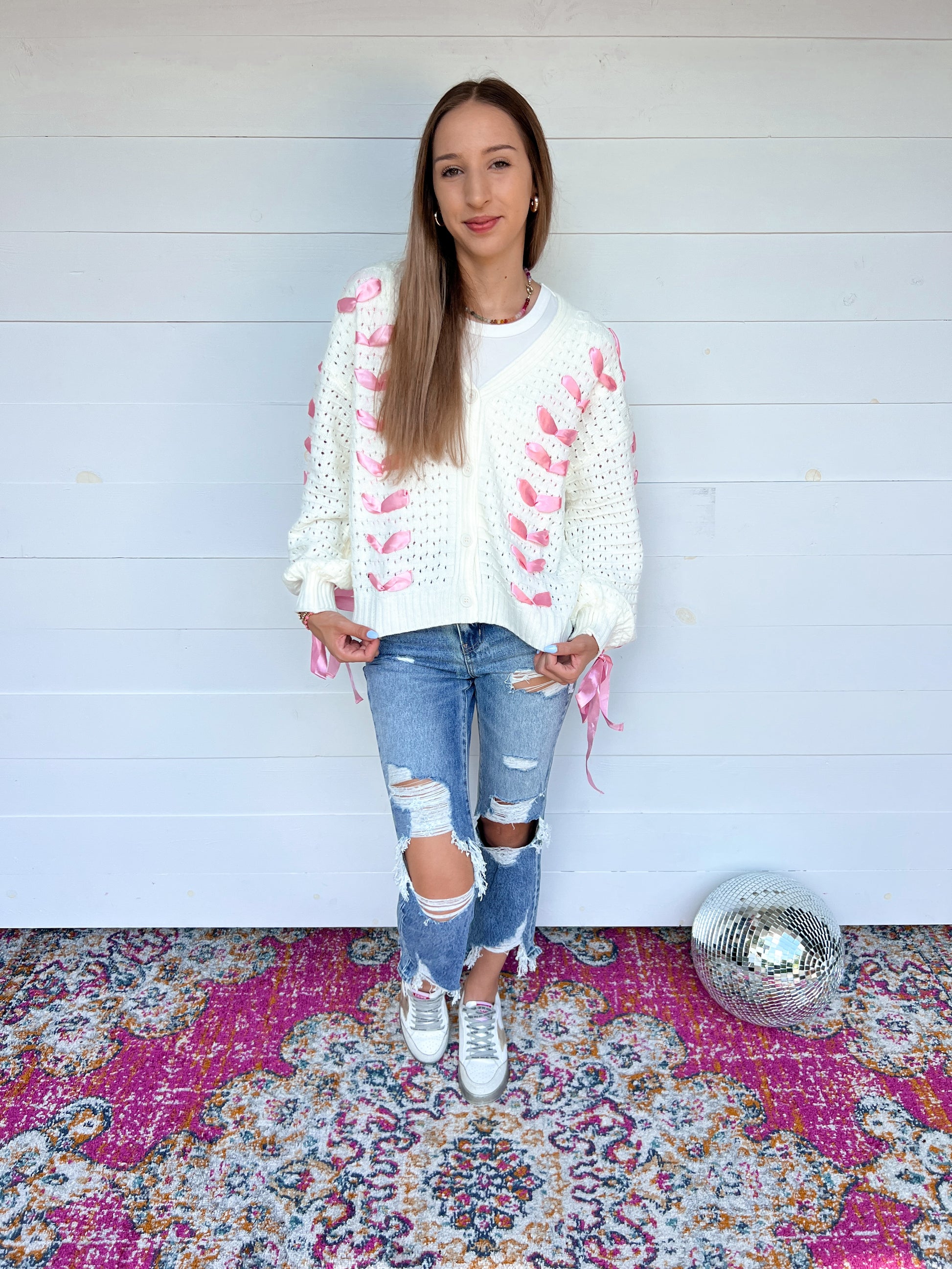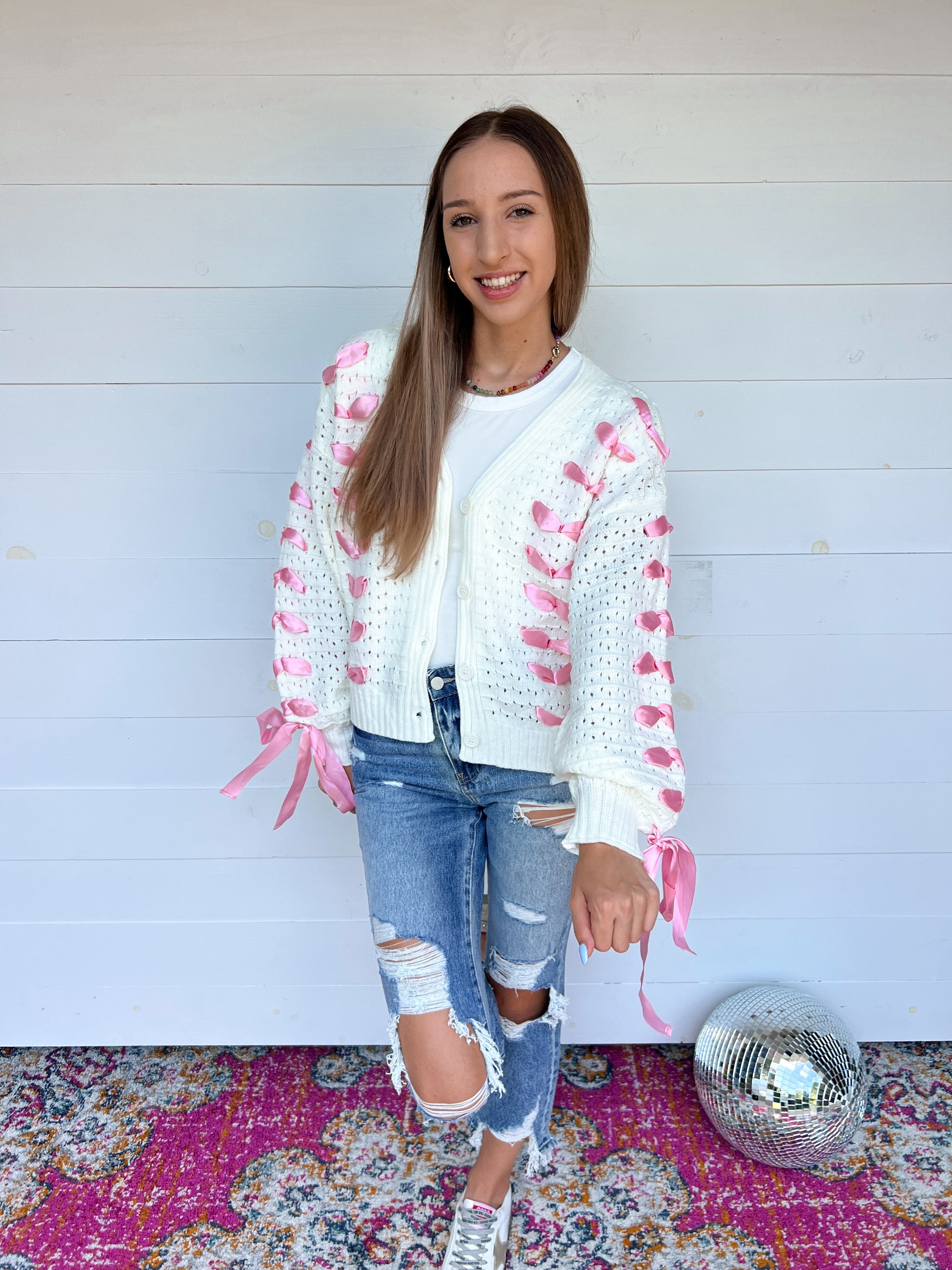 Elevate your style with our Lace It Up Cardigan! Featuring unique textured balloon sleeves and lace-up ribbon details on the sleeves and front, this cardigan is sure to make a statement. Add a touch of fun and detail to any outfit with this must-have piece.
